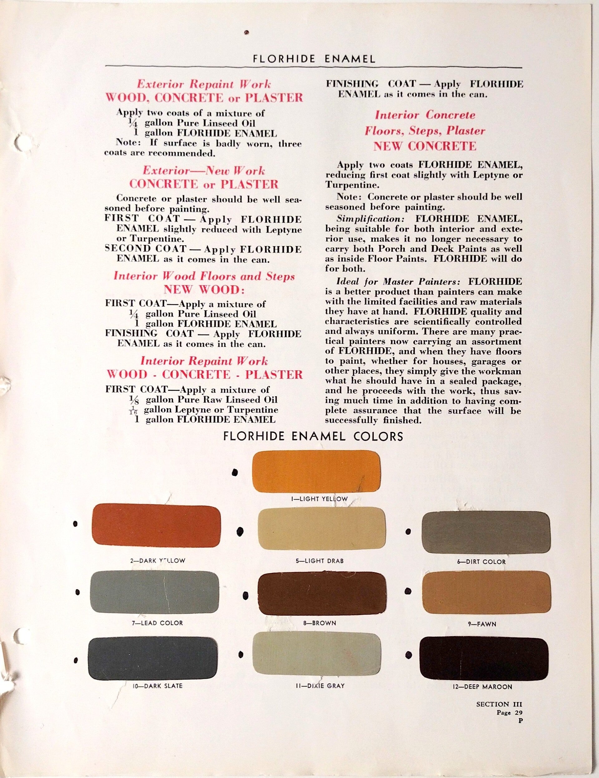 The 1936 Pittsburgh Plate Glass Company brochure introduces Florhide Enamel, a durable linseed oil-based paint suitable for both interior and exterior applications, including floors, decks, trim, and woodwork. This enamel was formulated to provide long-lasting coverage with the gloss and depth expected of early 20th-century oil-based finishes.