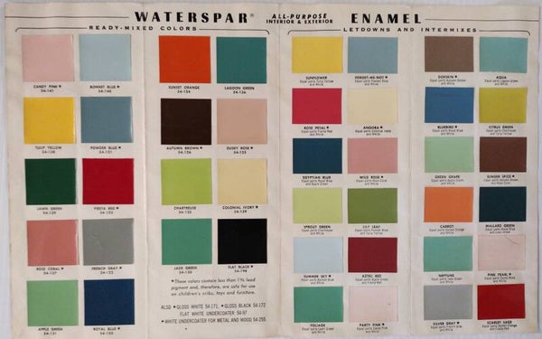 This Pittsburgh Paints catalog entry features Waterspar Enamel from 1950–1954, a durable enamel paint suitable for interior and exterior use. The 42 colors include a mix of vibrant and muted shades, reflecting the color trends of early 1950s mid-century homes. Examples include Sun Yellow, Rose Petal, Fiesta Red, Colonial Ivory, Sprout Green, Coral Wild Rose, Lily Leaf, Sunset Orange, Bluebird, and Citrus Green. This broad palette provided versatile options for walls, trim, woodwork, and exterior applications, balancing brightness with subdued elegance.