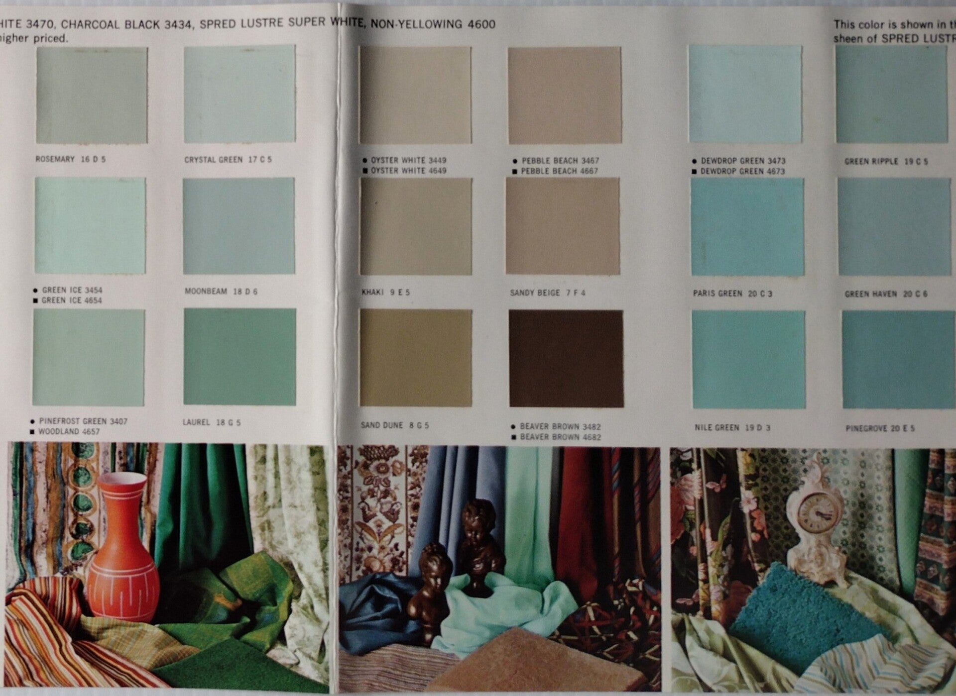 This 1967 Glidden catalog entry features Spred Satin, an interior latex paint line for walls and ceilings with 48 colors. Examples include Wedgwood, Caprice, Tan Glow, Linen, Parchment, Rice Cloth, Bone White, King's Gold, Straw, and Copper.